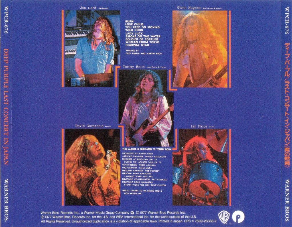 - “Nearly 12,000 rock fans filled the Budokan concert hall to see the new Deep Purple. The band had flown their producer, Martin Birch, in to supervise the recording of the album, and two film crews, one stationary and one mobile, were there to record the excitement on celluloid. Purple opened to pandemonium with “Burn” and with Tommy Bolin healthy again, they played their most explosive set of the tour. Jon Lord and Ian Paice dazzled the rock & roll ravers with an impromptu jam of “Woman From Tokyo”. Tommy Bolin mesmerized them with his echoplex during [sic] “Ode to G”.Glenn Hughes, one of rock’s funkiest bassists, had the girls screaming during his soulful rendition of “Georgia On My Mind” and David Coverdale was fully in command as he sang “Smoke on the Water”, the song that made Ian Gillan’s wail famous.” Peter Crescenti/Rolling Stone
